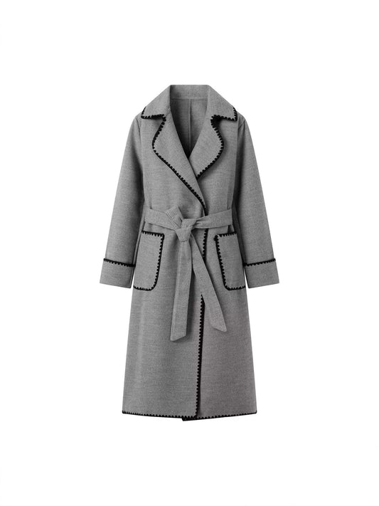 %40 İndirimKenar Dikiş Detaylı Kuşaklı Uzun Kaban