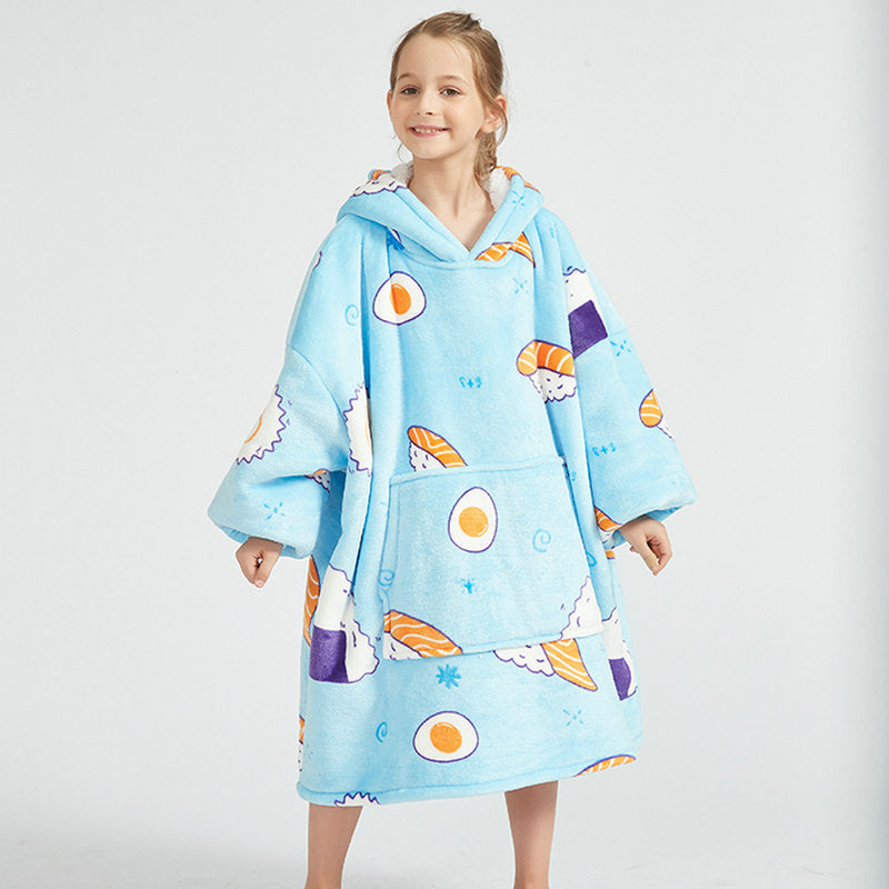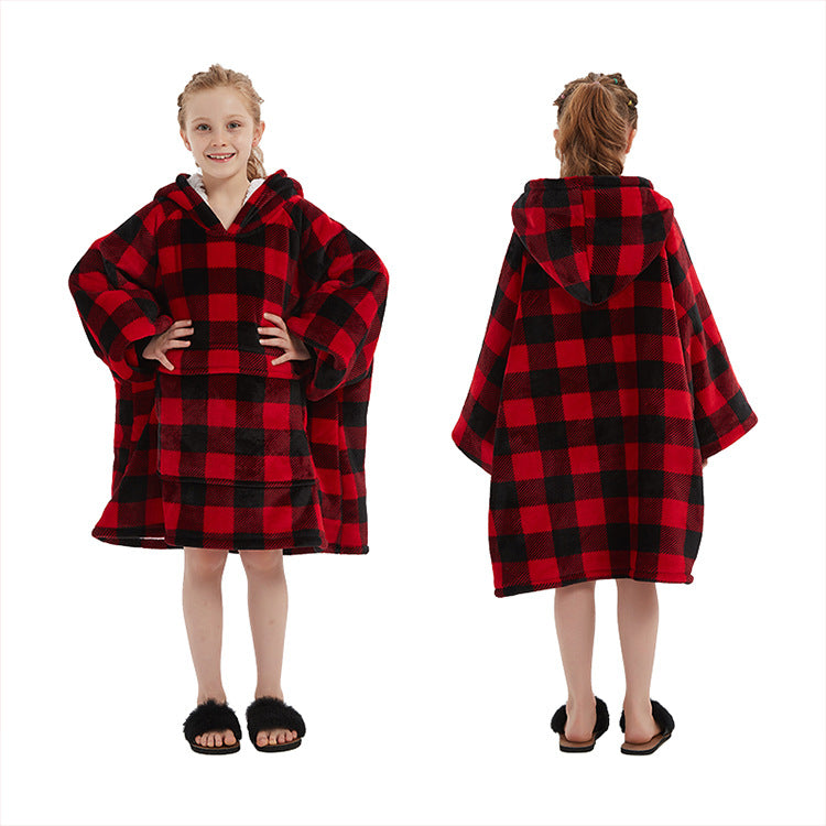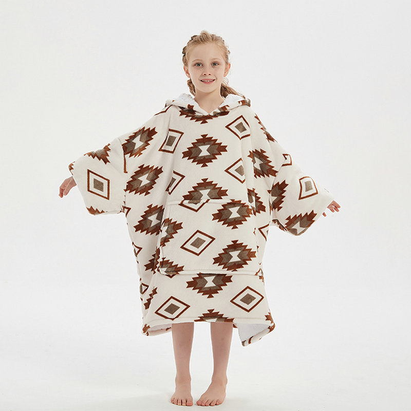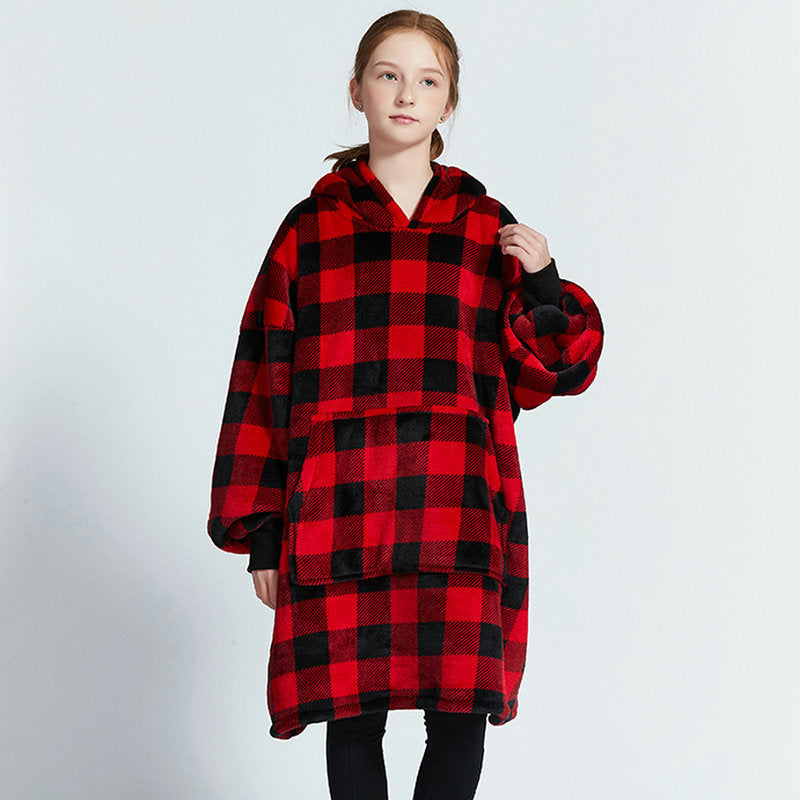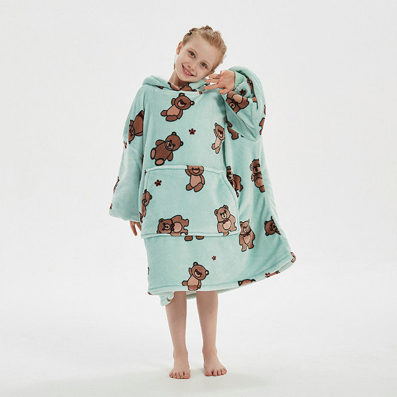 Genç çocuklar için özel olarak tasarlanmış bu flanel kapüşonlu battaniye, hem sıcak tutar hem de hareket özgürlüğü sağlar.