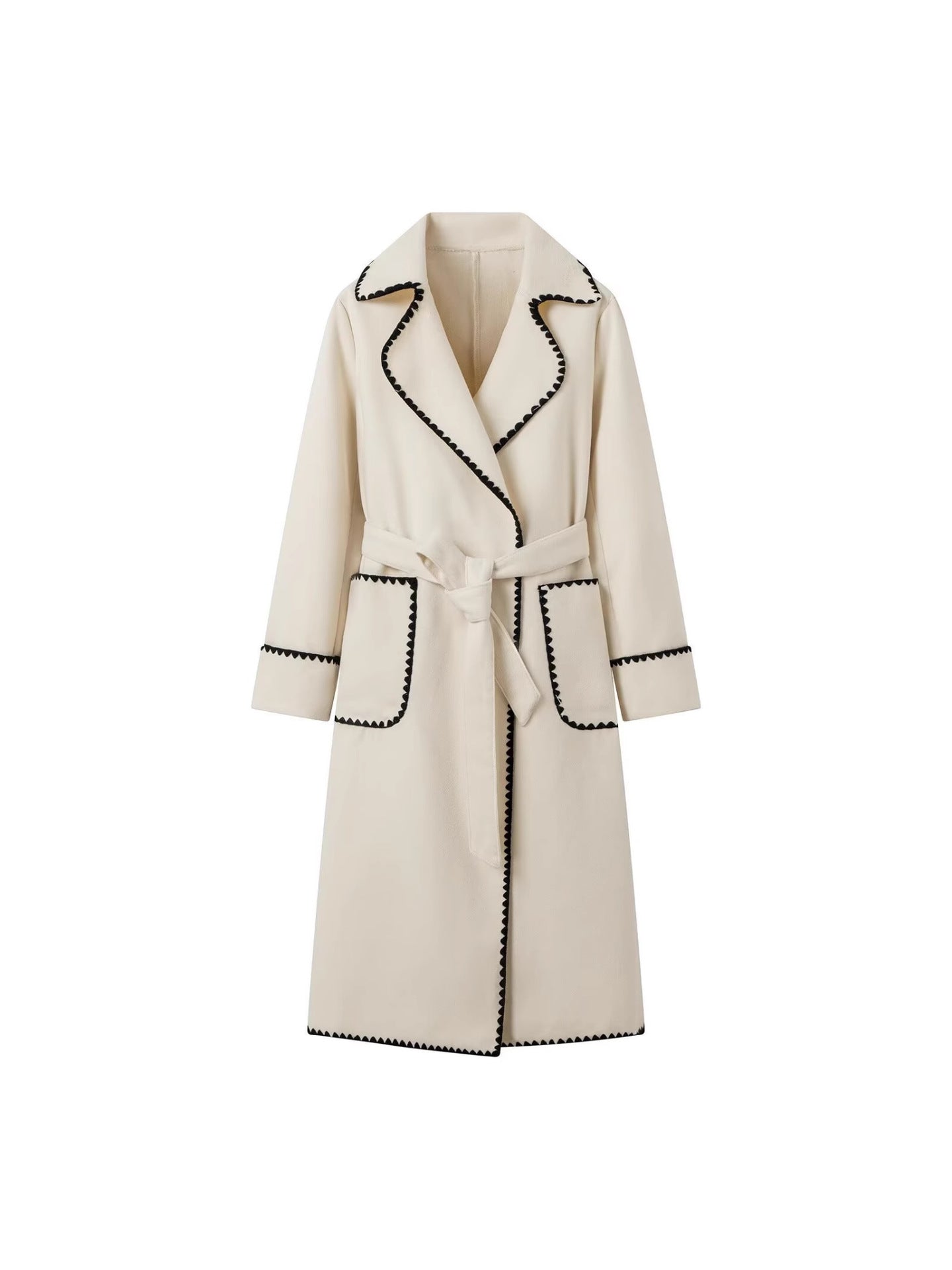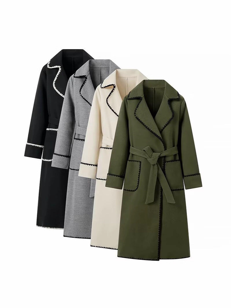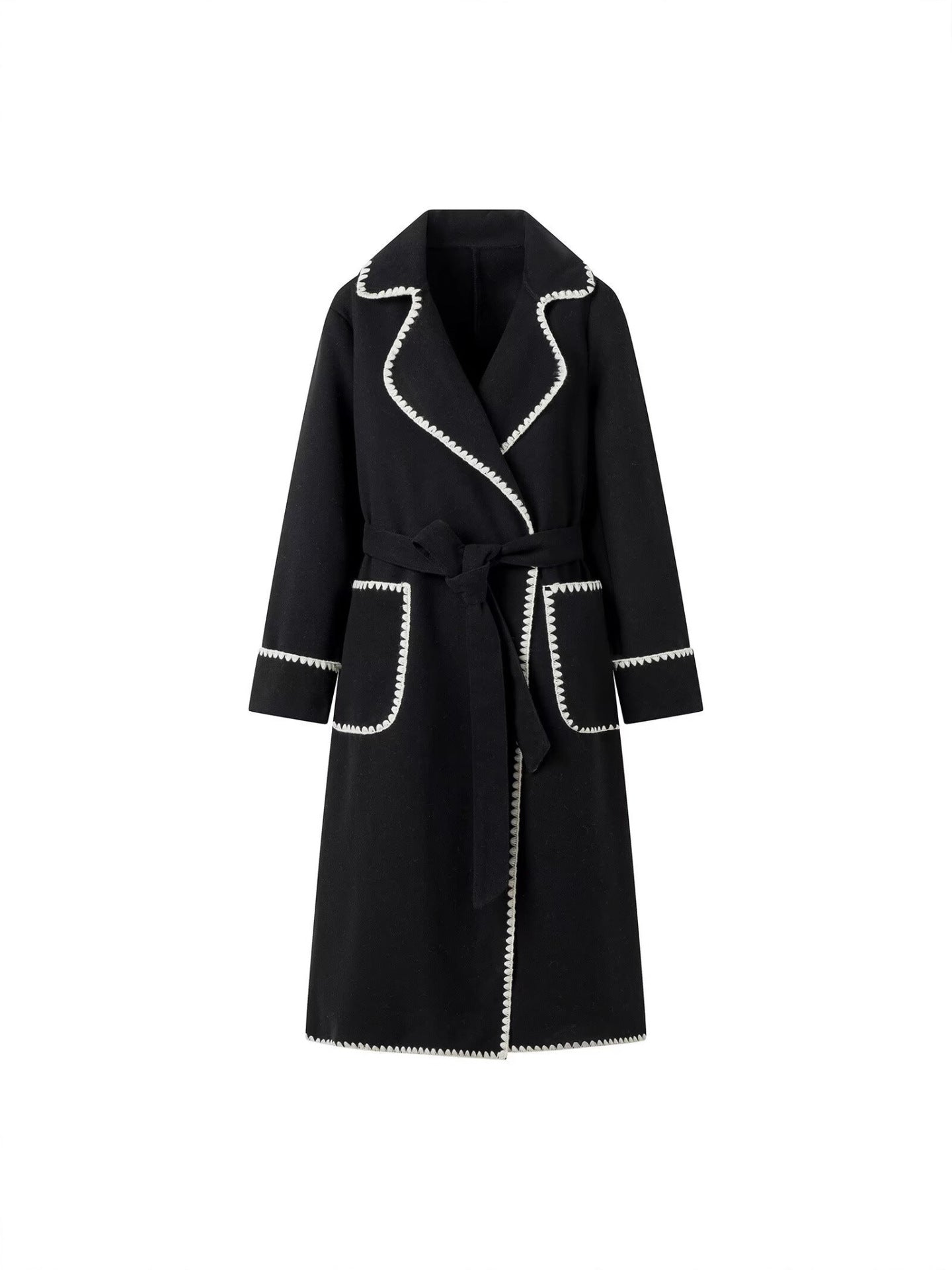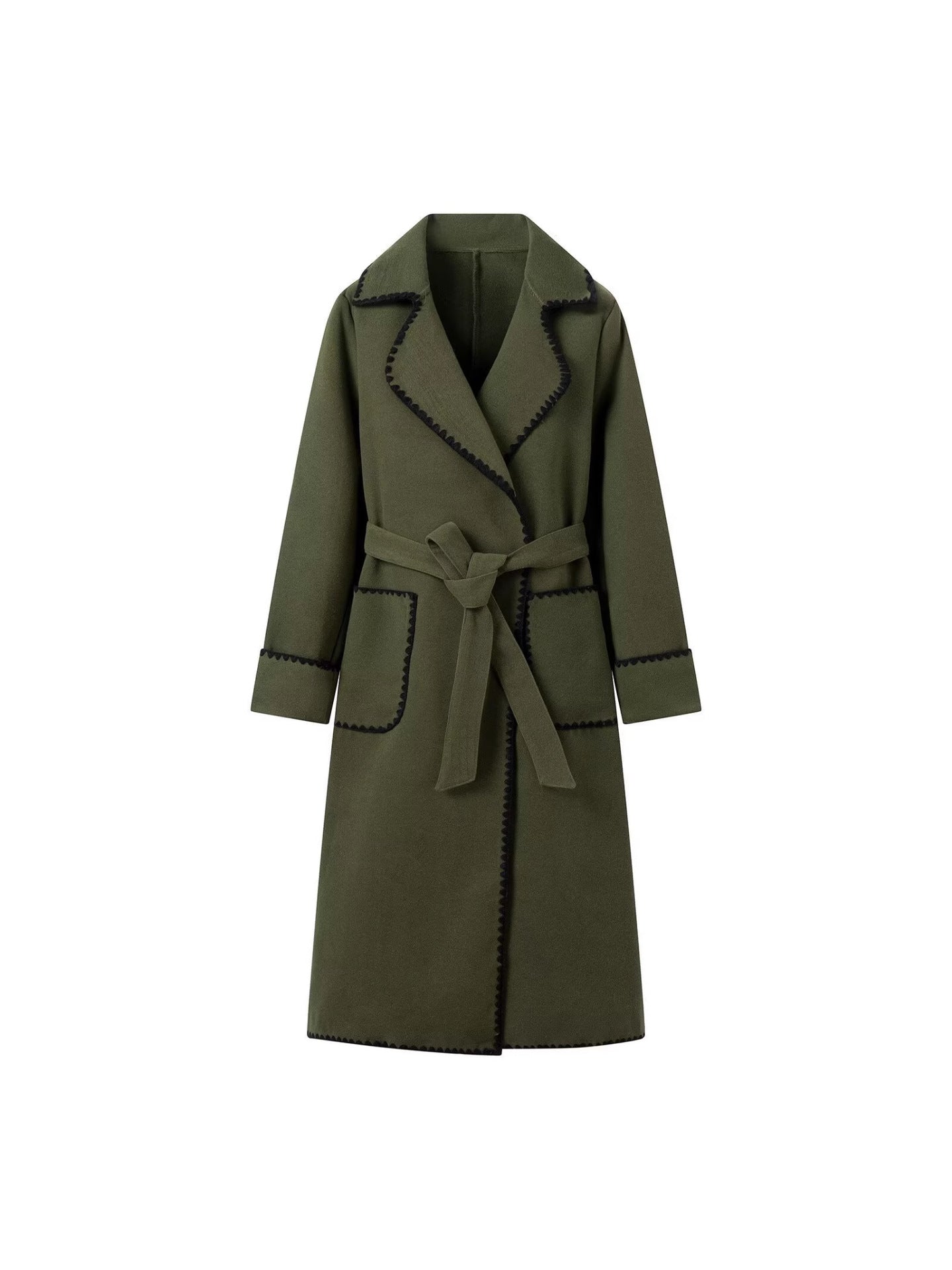 Kenar Dikiş Detaylı Kuşaklı Uzun Kaban