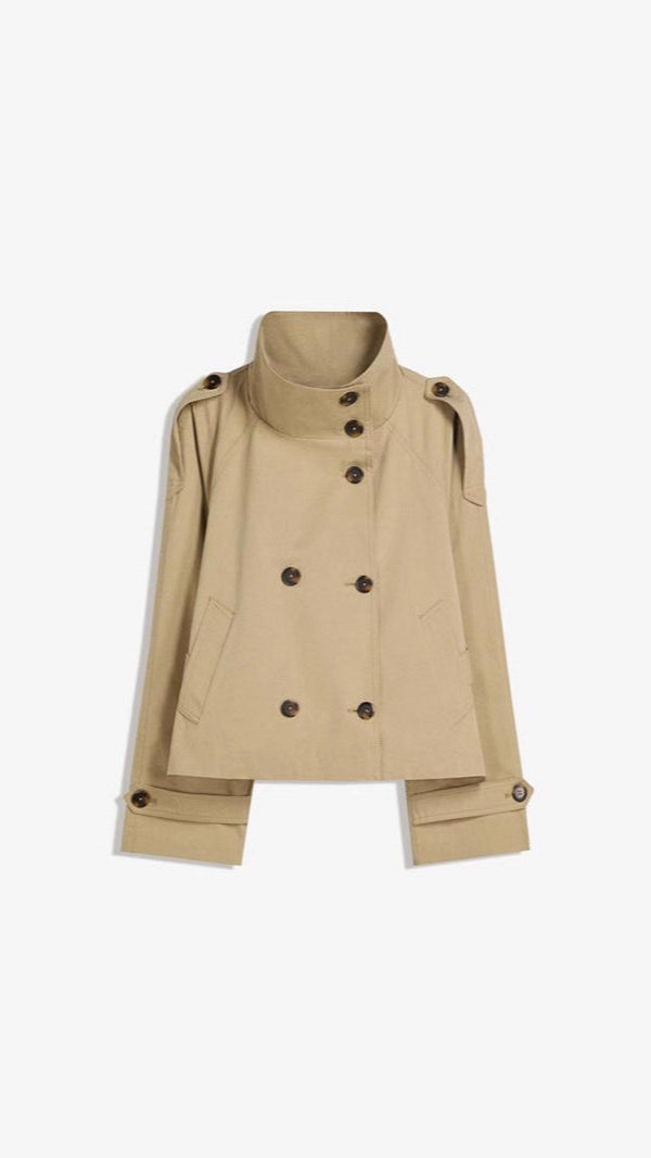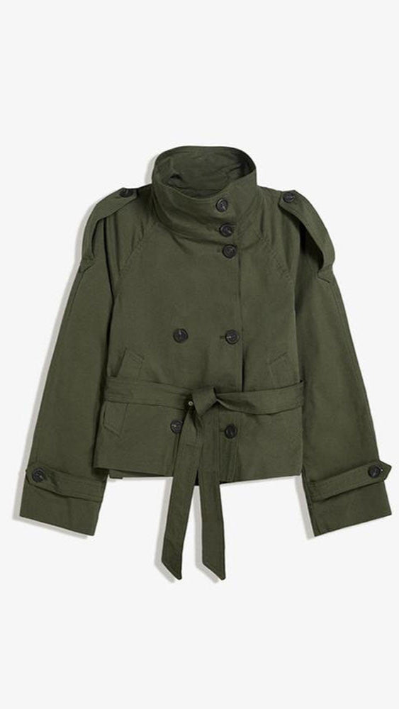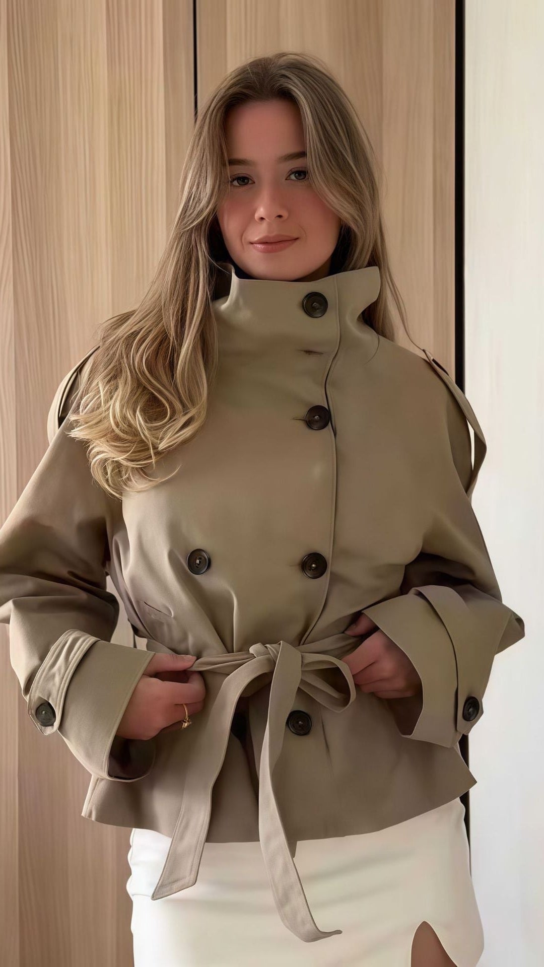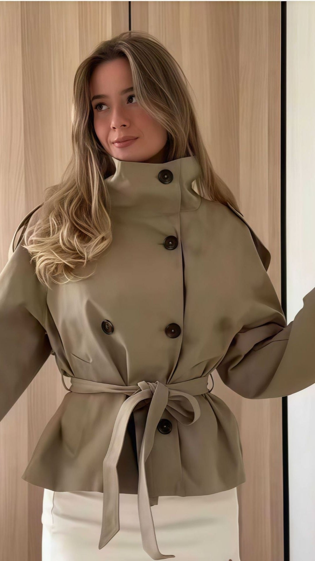 Yüksek yakası rüzgârı keserken, çift düğmeli kapanışı ve belden bağlamalı kuşak tasarımı siluetinizi zarifçe ortaya çıkarır. Yan cepleriyle fonksiyonel, geniş kalıbıyla konforlu; hem günlük kullanımda hem de şık kombinlerde stilinize uyum sağlar.