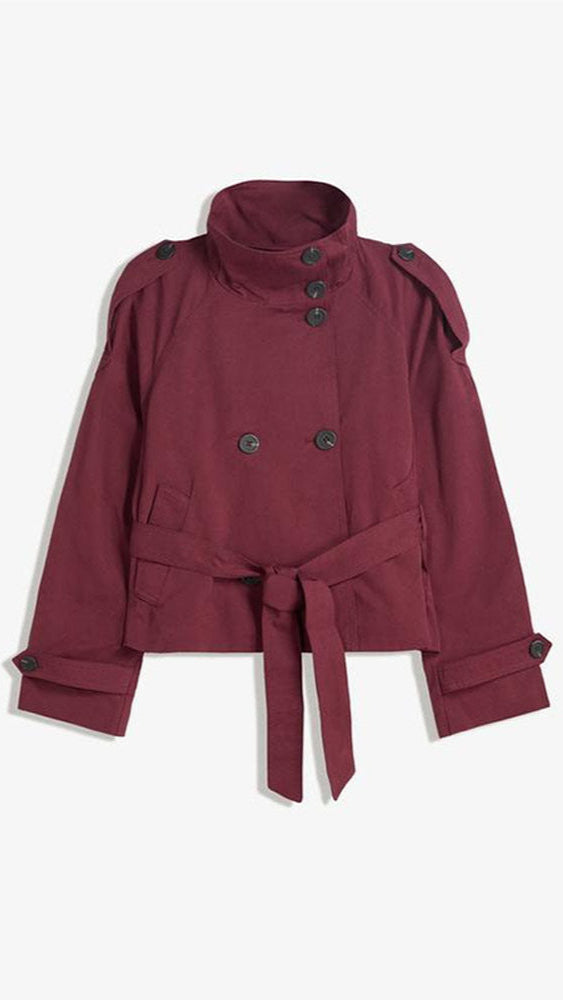 Şehir stilinin en güçlü tamamlayıcılarından biri: kuşaklı yüksek yaka trençkot ceket.