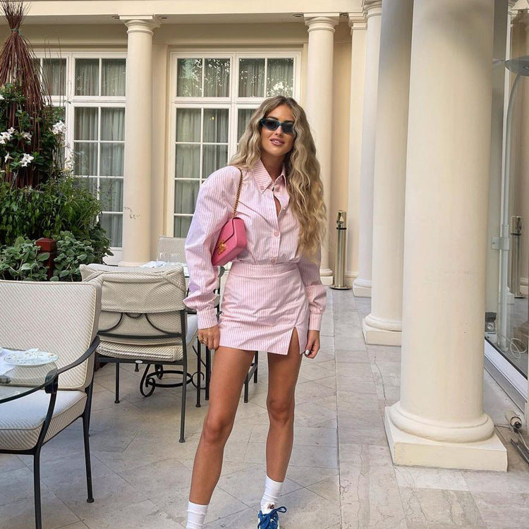 Dik yakalı oversize gömlek, vücuda oturan mini etek ile kusursuz bir denge oluşturur. Yan yırtmaç detayı hareket özgürlüğü sağlarken, sofistike bir görünüm kazandırır.