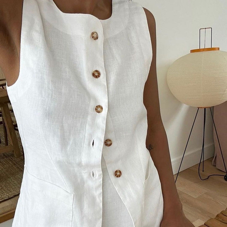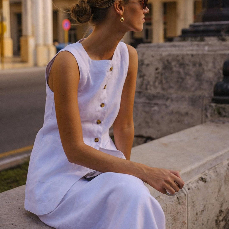 Bu sofistike keten ikili takım, doğal ve nefes alabilen kumaşı ile konforu ve şıklığı bir arada sunuyor. Günlük stilinize sofistike bir dokunuş katarken, özel günlerde de zarif bir alternatif olarak ön plana çıkıyor.
