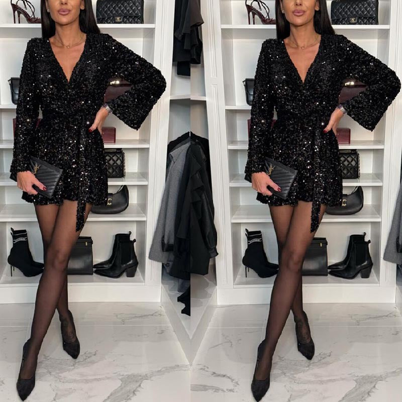 Gece davetlerinin yıldızı olmaya hazır mısın? Tamamı sim detaylı, V yaka, kuşaklı bel tasarımlı mini tulum; hem elbise şıklığı hem rahatlığı bir arada sunuyor. Esnek yapısı ve kaliteli işçiliğiyle özel günlerin vazgeçilmez parçası.